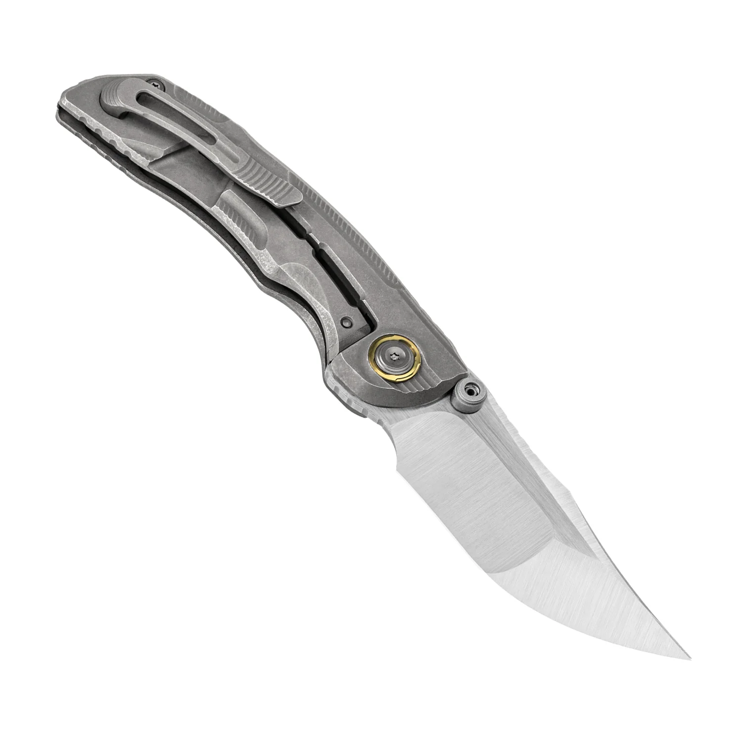 • Heavy stonewashed titanium handle with a milled mesh pattern and robotic wing feather texture.